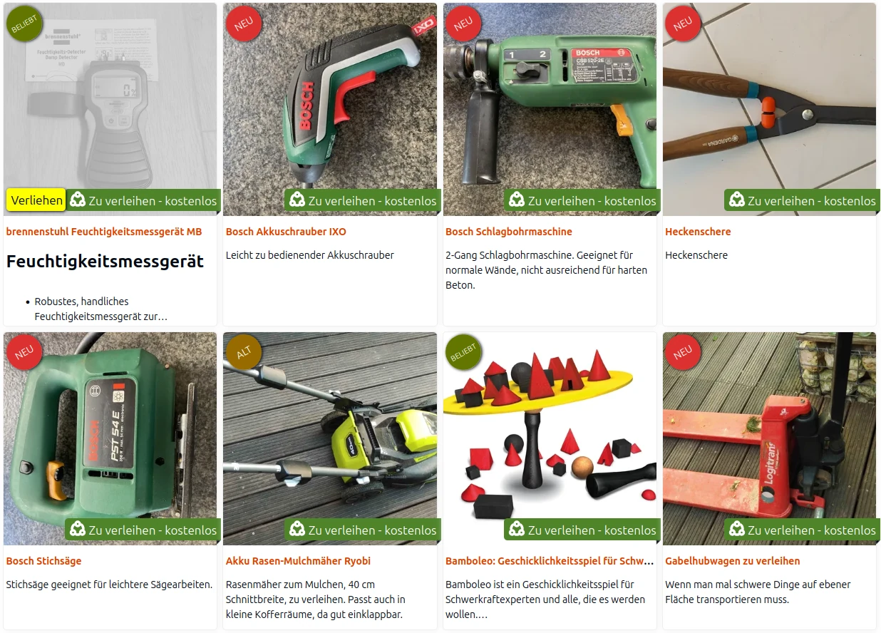 - Angebot durchsuchen: Stöbern Sie durch unsere Kategorien und entdecken Sie, was Ihre Nachbar*innen zur Ausleihe anbieten – von Bohrmaschinen über Kinderroller bis hin zu Rasenmähern